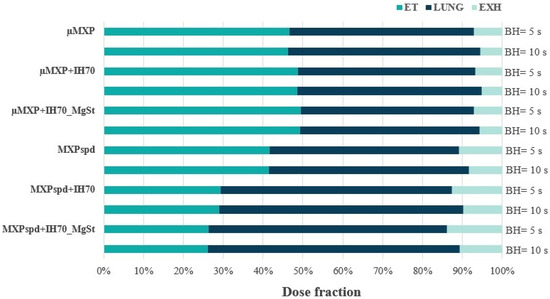 The in vitro ACI lung model is applicable for comparing the DPI formulations; however, this is a non-disease-specific model and has defined ECDs for a given L/min, while providing no information on the exhaled (EXH) fraction. However, it connects well to the in silico investigations; so, we used the obtained data from the in vitro measurements according to the SLM method described in Section 2.2.8., where we applied the COPD-specific parameters (inhaled air volume: 1.7 L, inhalation time: 3.2 s, breath-hold time (BH) after the inhalation: 5 s and 10 s, exhalation time: 3 s) based on Colthorpe et al. [67]. Based on the in silico results (Figure 4), the obtained values correlated with the trends, which were determined by the in vitro measurements. So, the mechanically micronized drug (µMXP) blended on the carrier or the surface-treated carrier did not achieve a high level of lung deposition and therefore resulted in a remarkable extrathoracic (ET) deposition. In the case of MXPspd, mixing with IH or IH_MgSt shows further improvement in ET and LUNG values. Nevertheless, the EXH results were slightly higher in the case of the MXPspd-containing formulations than in the samples containing µMXP, which could be traced back to the differences in the average particle size, the particle size distribution, and the MMAD values between the MXPspd and the µMXP particles. While all of these results were small/narrow ranges of samples containing MXPspd, they showed a slightly higher EXH. However, with the 10 s BH the EXH values decreased, while the LUNG values improved with the 5 s BH in all samples. After all, the EXH values were reduced when the 10 s BH was used, thereby improving the LUNG values compared to the usage of the 5 s BH in each sample.