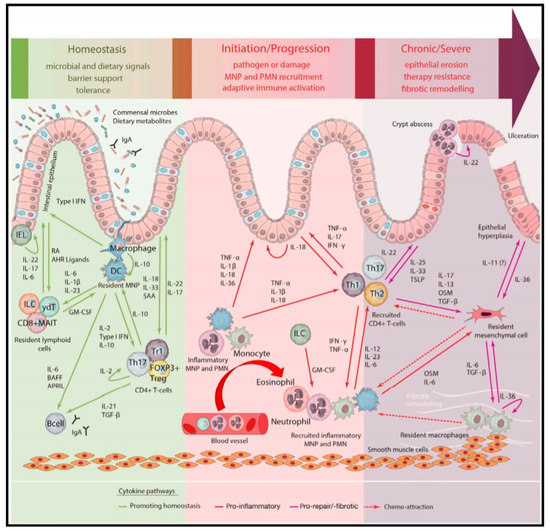 - Friedrich, M.; Pohin, M.; Powrie, F. Cytokine Networks in the Pathophysiology of Inflammatory Bowel Disease. Immunity 2019, 50, 992–1006. [Google Scholar] [CrossRef]