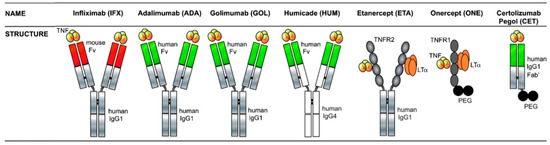 - Mitoma, H.; Horiuchi, T.; Tsukamoto, H.; Ueda, N. Molecular mechanisms of action of anti-TNF-α agents–Comparison among therapeutic TNF-α antagonists. Cytokine 2018, 101, 56–63. [Google Scholar] [CrossRef] [PubMed]