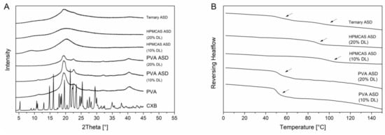 Solid state of the ASDs. X-ray powder diffraction (XRPD) diffractograms (A). Differential scanning calorimetry (DSC) thermograms (B), glass transition temperatures are indicated by the arrows.