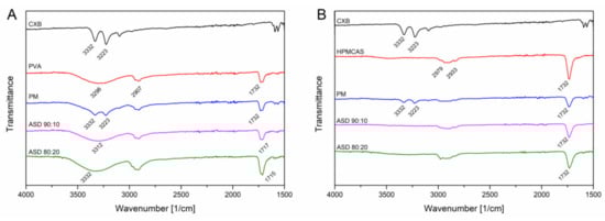 Fourier-transformed infrared spectra of CXB-PVA formulations (A) and CXB-HPMCAS formulations (B).
