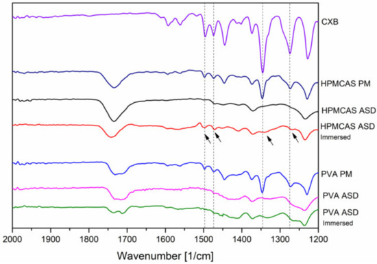 In addition, FT-IR spectra of the 20% drug load ASDs were recorded after immersion with buffer solution (for 15 min) and subsequent drying to investigate the phase behavior and interactions upon contact with buffer medium. After exposure of buffer medium, for the HPMCAS ASD some specific peaks from CXB appeared again, indicated by the arrows in Figure 6.