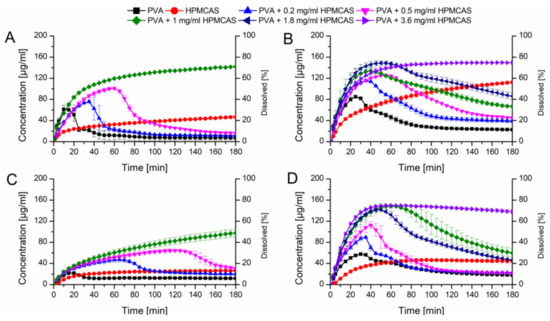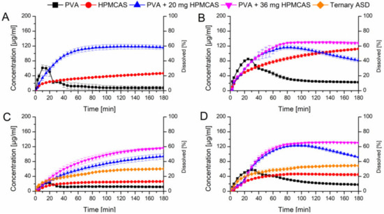 Initially, the HPMCAS and PVA ASDs at a drug load of 10% without additives were tested in PBS buffer at pH 6.8 (Figure 7A). The HPMCAS ASD showed a slow dissolution rate ending up at 40 µg/mL and the relative AUC was 23.1%. The PVA ASD showed a fast dissolution rate reaching a concentration of 60 µg/mL in 10 min, which was followed by a precipitation over time, resulting in a relative AUC of 9.9%.