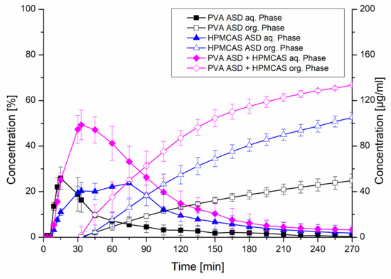 The formulations exhibiting 20% drug load including the HPMCAS ASD, the PVA ASD and the PVA ASD with HPMCAS powder (equivalent to a HPMCAS concentration of 1.8 mg/mL) were further investigated in the biphasic dissolution test using FaSSIF as biorelevant medium. In the aqueous phase, the PVA ASD showed a similar initial dissolution behavior compared to the monophasic test. The HPMCAS ASD showed a more moderate dissolution, which reached a plateau after approx. 40 min, which was in accordance to the monophasic dissolution. The most pronounced dissolution was observed for the PVA ASD with HPMCAS powder, which reached a concentration of 50 µg/mL after 30 min, comparable to the monophasic test. Subsequently, a drop in concentration in the aqueous phase occurred, which was related to the addition of the organic layer after 30 min, because the dissolved CXB started partitioning into the organic layer. The partitioning rates of the three tested formulations into the organic phase were in accordance to the rank order of the dissolution in the aqueous phase. The combination of the PVA ASD with the HPMCAS powder resulted in a partitioned amount of 66.8%, whereas final partitioned amount of CXB from the PVA ASD was only 24.8%. Consequently, the addition of the HPMCAS powder to the PVA ASD led to a 2.7-fold increased partitioned amount. The biphasic dissolution of the HPMCAS ASD resulted in a partitioned amount of 52.5% (Figure 9).