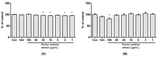 Cytotoxicity of R. acetosa extract in (A) Caco-2 cells and (B) HEK293 cells (n = 6). Con—media only treated control; Veh—vehicle treated group; *—p < 0.05 compared to media only treated control group.
