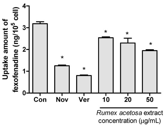 Inhibitory effect of R. acetosa extract on fexofenadine uptake in OATP1A2/SLCO1A2 transfected HEK293 cells (n = 6). Con—OATP1A2/SLCO1A2 transfected control; Nov—untransfected control; Ver—100-μM verapamil; *—p < 0.05 compared to control group.