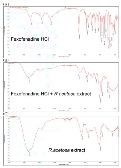 FT-IR spectra of (A) fexofenadine, (B) a mixture of fexofenadine and R. acetosa extract and (C) R. acetosa extract.