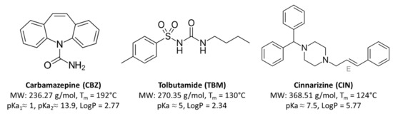 Therefore, the aim of this research is to investigate the influence of the API properties on the characteristics of semi-crystalline solid dispersion based on Gelucire® 50/13 and Gelucire® 48/16 prepared by spray congealing. Three BCS class II APIs (Figure 1) have been selected, having different physicochemical parameters. Specifically, carbamazepine (CBZ), tolbutamide (TBM), and cinnarizine (CIN) were selected as neutral, acid, and basic compounds, respectively. The systems containing the model drugs were studied in terms of solid-state properties using various techniques (spectroscopic, microscopic, and thermal ones) in order to investigate possible solid state modifications and interactions between drugs and carrier resulting from the melting-based production process. In addition, the solubility and dissolution performances of the drug loaded-MPs were evaluated. Further, the possible correlations between physicochemical properties of the APIs, their physical state in solid dispersion, and in vitro performance were discussed.