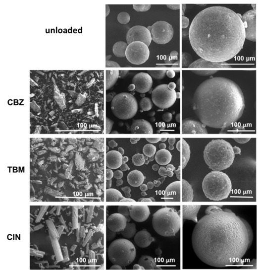 SEM images of unloaded MPs C and MPs C loaded with the model APIs at two different magnifications (center and right). The pure APIs are also shown (left).