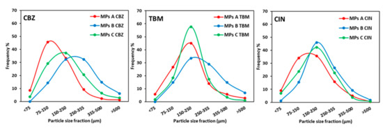Figure 2 reports as example the SEM images of MPs C containing the different APIs compared with the drug-free (unloaded) MPs C. The appearance of the API-loaded MPs, including shape and sphericity, was similar to the unloaded ones. The particle size analysis of the MPs (Figure 3) showed a Gaussian size distribution from 75 to 500 μm. In general, the prevalent particle size fraction was in the range of 150–250 μm. However, MPs A tended to have slightly smaller size compared to MPs B and C (e.g., MPs A CBZ main particle size fraction was 75–150 μm), while formulation B showed a slightly broader size distribution with a shift to bigger dimensions (as seen for CBZ and TBM) compared to MPs A and C. Thus, the particle morphology and size appeared to be more influenced by the carrier composition with respect to the type of API loaded.