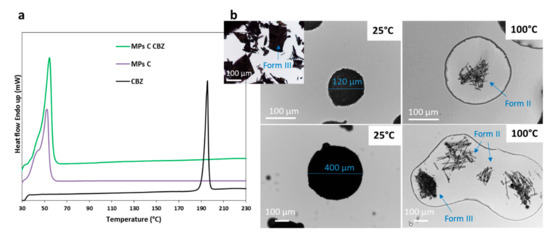 (a) DSC curve of CBZ, unloaded MPs C and MPs C CBZ; (b) HSM analysis of CBZ (small image on the left at 25 °C) and MPs C CBZ at 25° and 100 °C of small size (on the top) and large size (bottom).