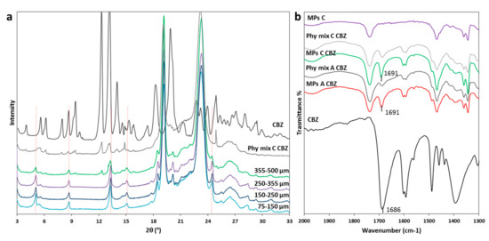 (a) XRPD spectra of different size fractions of MPs C CBZ compared to CBZ and Phy mix C CBZ; (b) FT-IR spectra of CBZ, MPs A CBZ, Phy mix A CBZ, MPs C CBZ, Phy mix C CBZ and unloaded MPs C in the spectral region 2000–1300 cm−1.