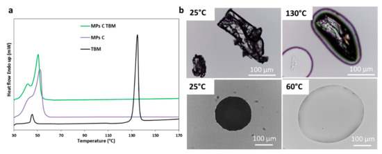 (a) DSC of TBM, unloaded MPs C, and MPs C TBM; (b) HSM images of TBM (on the top) and MPs C TBM (on the bottom).