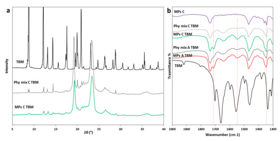 (a) XRPD spectra of TBM, Phy mix C TBM, and MPs C TBM; (b) FT-IR spectra of TBM, MPs A TBM, Phy mix A TBM, MPs C TBM, Phy mix C TBM and unloaded MPs C in the spectral region 2000–1300 cm−1.