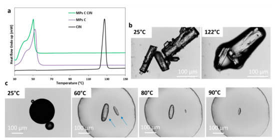 The DSC data are showed in Figure 8a. The melting of the drug occurred at 122–124 °C. Similar to the other APIs, the drug melting endotherm was absent in the curve of CIN-loaded MPs C. As observed for TBM, in the case of CIN as well, the endothermic peak of Gelucire in the drug-loaded MPs was shifted to slightly lower temperatures (50 °C) compared to the pure carrier (52 °C), suggesting a certain degree of API solubility in the molten carrier. As shown in Figure 8b, CIN original crystals are regular column-shaped crystals, which melted at 122 °C in agreement with the endothermic event observed by DSC. The HSM analysis of MPs (Figure 8c), showed that crystals of CIN can be observed upon carrier melting (arrows in Figure 8c). Specifically, the crystals had similar morphology to the original one, but with smoother rounded borders. The API progressively solubilized in the carrier with the increasing of the temperature, and the solubilization was complete within 100 °C. Again, this observation explained the lack of drug endothermic peak in the DSC and confirmed the property of molten Gelucire in solubilizing the API crystals in a temperature-dependent manner.