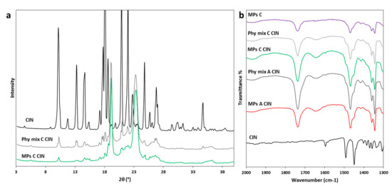 (a) XRPD spectra of CIN, Phy mix C CIN and MPs C CIN; (b) FT-IR spectra of CIN, MPs A CIN, Phy mix A CIN, MPs C CIN, Phy mix C CIN and unloaded MPs C in the spectral region 2000–1300 cm−1.