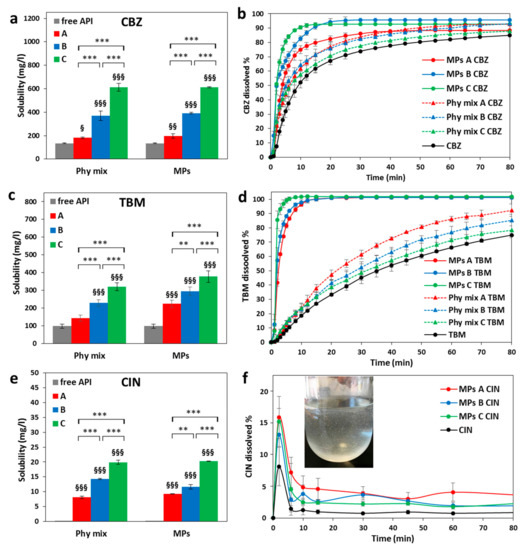 (a,c,e) Solubility studies of MPs and Phy mix compared to the pure APIs. Data represent mean ± S.D. (n = 3), the level of significance was set at the probabilities of § p < 0.05, §§ p < 0.01, §§§ p < 0.001 compared to the free API, and ** p < 0.01, *** p < 0.001 the statistical significance between the different formulations of Phy mix and MPs; (b,d,f) Dissolution profiles and of MPs A, MPs B, and MPs C compared to the pure APIs. For CBZ and TBM, a comparison of MPs dissolution profiles with the corresponding Phy mix has also been performed (dotted curves). For CIN, a photograph of the dissolution medium at the end of MPs C CIN dissolution test has been added.
