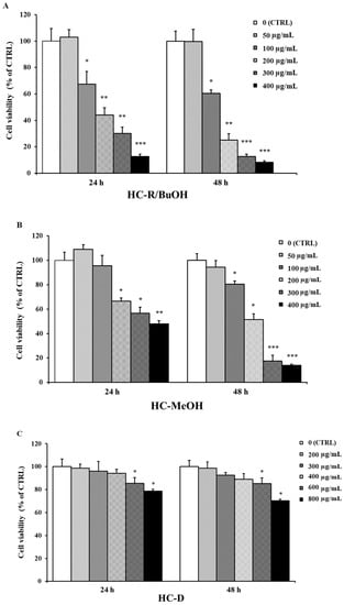 Viability of HepG2 cells treated for 24 and 48 h with different concentrations of (A) HC-R/BuOH, (B) HC-MeOH, (C) HC-D, (D) HC-I, (E) HC-M. Data are expressed as the mean ± SE of three independent experiments (n = 3) and were analyzed by one-way ANOVA followed by Dunnett’s post-hoc test, * p < 0.05, ** p < 0.01 and *** p < 0.001 vs. CTRL (100% viability).