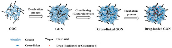 Schematic illustration of fattigation-platform Gelatin–Oleic Nanoparticles (GON) preparation and drug loading process.