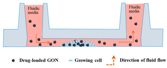 The microfluidic chamber was connected to the calibrated BMS, consisting of a peristaltic pump, media, microfluidic cell chamber, bubble trap, and tube, according to the previous studies [24,25]. The BMS, except the pump, was run in the incubator (37 °C and 5% CO2) during the whole experiment. The cell media containing GONs was delivered using the peristaltic pump throughout the microfluidic cell chamber, and the cell monolayer experienced shear stress, as shown in Figure 2. In this study, different levels of shear stress, i.e., 0.5, 5, and 50 dynes/cm2, were tested. For comparison, cells were also incubated with media containing GONs in the absence of microfluidic shear stress in static conditions. Cells were also incubated with only fresh cell media without adding GONs under the static condition as a control.