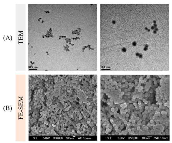 The structure of the NPs was observed by transmission electron microscopy (TEM). Ten microliters of the NP solution were dropped on a copper grid covered with formvar-coated film and dried for 1 day before measurement by the TEM apparatus (TECNAI G2 F30 S-TWIN, FEI Company, Hillsboro, OR, USA). The surface morphologies of the NPs were visualized by field-emission scanning electron microscopy (FE-SEM). The solution samples of the NP formulation were dropped on the mounted carbon film. Then, they were coated with Au-Pd and determined by FE-SEM measurements (JSM 6700F, JEOL, Akishima, Japan).