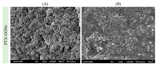 FE-SEM images of PTX-GONs according to states in the conditions: (A) the normal state and (B) the deformed state of PTX-GONs after shear stress was applied at 50 dynes/cm2.