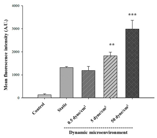 To compare the cellular internalization of GONs by cancer cells in the presence of shear stress, A549 cancer cell lines were selected for flow cytometry and confocal imaging. Several microfluidic system studies used the alveolar epithelial A549 cells as a model cell for explaining the intracellular mechanism and molecular signals coming from the fluidic shear force conditions in the vasculature [35]. Therefore, A549 cell lines were optimum model cells for designing the evidence-based microfluidic system. The cells were incubated for 1 h under static or biomimetic flow conditions with 0.5, 5, and 50 dynes/cm² shear stress. The quantitative evaluation by flow cytometry showed that the mean fluorescence of C-GONs was slightly decreased due to the presence of low shear stress, according to the increase in shear stress level (Figure 5). The cellular uptake of C-GONs at 5 and 50 dynes/cm2 was significantly higher compared to the static condition. The quantitative results from the flow cytometer corresponded to the qualitative results from the confocal laser scanning microscopy (CLSM) (Figure 6). The intensity of green fluorescence indicated the intracellular uptake of C-GONs, while the blue fluorescence image indicated the dyed cell nucleus. Confocal images clearly showed the increased green fluorescence of coumarin as the shear stress was increased as compared to the static condition cells. These results corresponded to previous research that negatively charged NPs had shown improved cellular uptake due to the presence of shear stress [25].