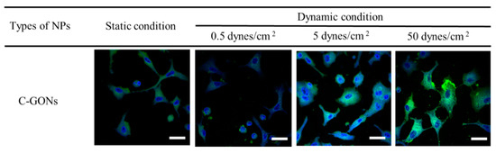 The cellular uptake studies of C-GONs confirmed that the cellular uptake of anionic C-GONs under dynamic conditions was significantly increased in comparison with the static condition, resulting in higher cell-killing efficiency under dynamic conditions. It was proven that the cationic NPs showed shear stress-dependent cellular uptake, while the anionic NPs were less affected by shear stress in the cellular microenvironment. Our results supported the idea that the surface charge of NPs was a critical parameter of cellular uptake. Strong negatively charged particles required more time to be taken by cells via endocytosis or active transport due to the strong repulsion between negatively charged groups and the surface of the cell membrane [36]. However, the interaction between particles and cells was somewhat constrained by the fluid shear force at lower levels.