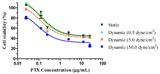 The cell-killing efficiency of PTX-GONs in static and dynamic conditions was evaluated by an MTT assay (Figure 7). The IC50 value of PTX corresponded to the plasma levels of the drug achievable in human subjects. The decrease in cell viability, as measured by the MTT test, may have resulted in the inhibition of cell growth or cytotoxicity. The cells were also incubated with drug-free GONs to ensure that the cytotoxicity was caused by PTX. The vehicle of NPs used to test cytotoxic activity had the same concentration of blank GONs as the sample containing the highest concentration of PTX (25 μg/mL). No cytotoxicity activity was observed for the blank GONs, even in the presence of shear stress. Therefore, the cytotoxicity of PTX-GONs was attributed only to PTX, rather than GONs consisting of non-toxic and biocompatible materials. These results suggested that GONs maintain the pharmacological activity of PTX and efficiently deliver the PTX to the cells. The cytotoxicity of the PTX-GONs was dependent on the dose concentration of PTX. An MTT assay was performed on PTX-GONs under static and dynamic conditions to compare the effects of fluidic shear stress on drug efficacy.