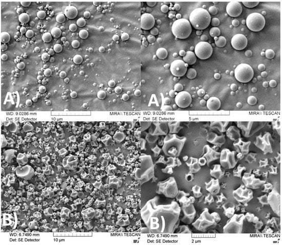 Pictures of powders were taken using a Mira XMU (Tescan, Brno, Czech Republic) SEM. The dry powders were coated with a 10 nm-thick gold film and scanned by electrons accelerated under a voltage of 5 kV. Images were formed from the collection of secondary electrons.
