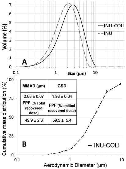 The geometric particle size distribution (PSD) measured by laser diffraction was slightly shifted to larger sizes in the presence of COLI compared to particles of INU alone (Figure 3A). D(50) values of the PSD of INU and INU-COLI particles were 1.86 ± 0.24 µm and 2.42 ± 0.31 µm, respectively. Aerodynamic properties of the INU-COLI particles (Figure 3B) demonstrated suitability for powder pulmonary inhalation, having a mass median aerodynamic diameter (MMAD) of 2.68 ± 0.07 µm and a geometric standard deviation (GSD) of 1.98 ± 0.04. This MMAD value is in the range of the breathable fraction of an aerosol, with an MMAD between 1 and 5 μm, considered suitable for topical respiratory treatment []. Particles having an MMAD between 1 and 3 μm have high peripheral deposition compared with particles having an MMAD close to 5 μm []. The fine particle fraction (FPF), defined as the percentage of inhaled fine particle mass (particles having an aerodynamic diameter less than 5 µm) relative to the total mass of particles emitted from the DPI, was 59.5 ± 5.4%.
