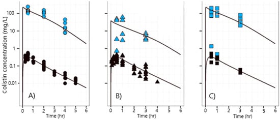 COLI concentrations measured in plasma (black symbols) and epithelial lining fluid (ELF) (blue symbols) and typical prediction of the model (solid lines) after intratracheal administration of (A) COLI solution as published by Gontijo et al. []; (B) INU-COLI dry powder; (C) COLI solution made by dissolving the INU-COLI powder. COLI dose delivered was 0.35 mg·kg−1 (base form).