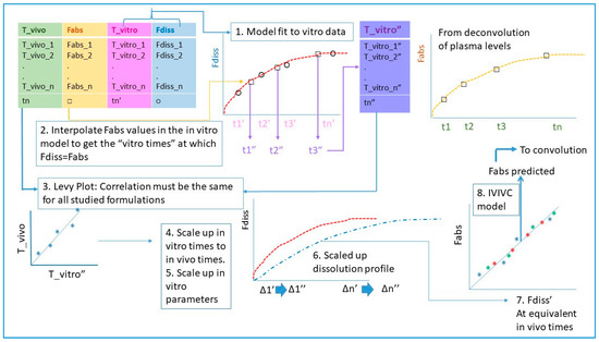 Steps describing the calculations to establish a two-step in vitro–in vivo correlations (IVIVC) when in vivo and in vitro dissolution processes take place at different rate and in consequence the time scale is different.