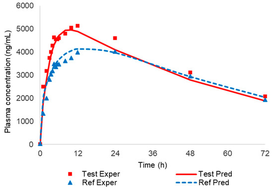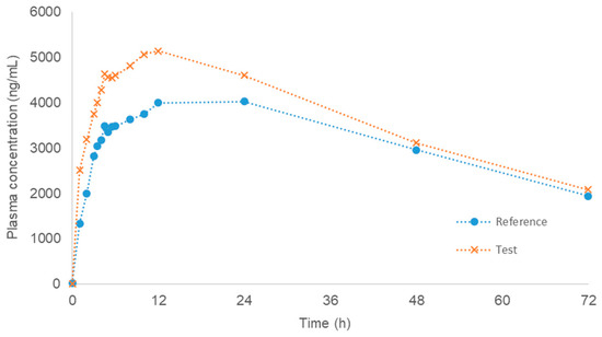 Figure 1 shows the average plasma levels for both assayed formulations (test and reference). Figure A1 in the Appendix A represents the individual plasma levels, and Figure A2 includes the average levels with error bars.