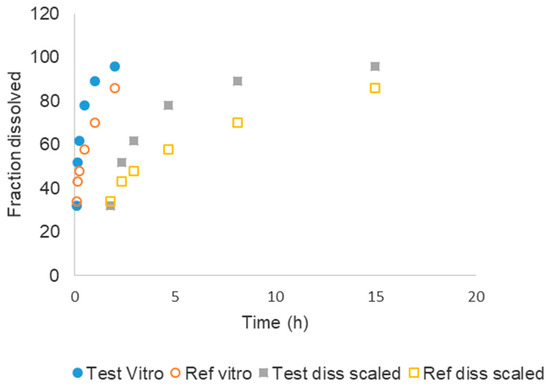 With the new Weibull parameters, it is possible to estimate the fraction dissolved at any time. Table 3 in column 5 shows the in vitro dissolved fractions estimated at the same equivalent in vivo times with the new scaled Weibull parameters.