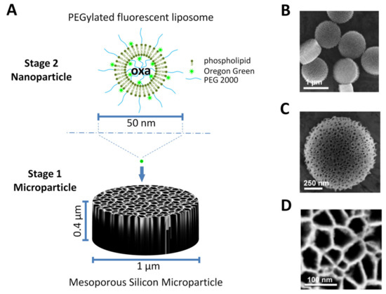 Mesoporous silicon microparticles (MSMP) and multistage vector (MSV). (A) Scheme of MSVs, showing the geometry and size of the MSMPs and liposomes; (B–D) scanning electron micrographs showing discoidal-shaped MSMPs 1 µm in diameter, 0.4 µm thick and with 60 nm pores; (B,C) two micrographs at different magnifications (reprinted (adapted) from Journal of Controlled Release, Vol. 158, Pages No. 148–155, Rapid tumoritropic accumulation of systemically injected plateloid particles and their biodistribution, van de Ven A.L. et al., Copyright (2012), with permission from Elsevier.) [12]; (D) detail of pores [reprinted (adapted) from Accounts of Chemical Research, Vol. 44, Pages No. 979–989, Multistage Nanovectors: From Concept to Novel Imaging Contrast Agents and Therapeutics, Godin B. et al., Copyright (2011), with permission from American Chemical Society [36].