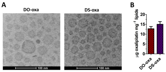Cryo-TEM microscopy confirmed the size and PDI of the two selected oxa-loaded liposomes (Figure 2A). Reverse-phase HPLC analysis with DAD detection (Figure 2B) revealed a loading efficiency of 15.0 ± 1.4 µg oxa/mg lipids for DS-oxa and 12.7 ± 1.1 µg oxa/mg lipids for DO-oxa.