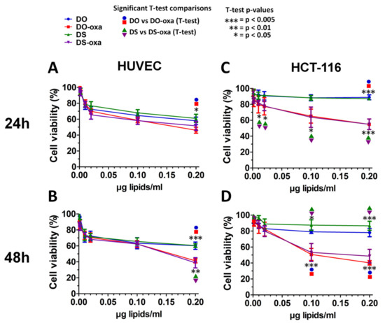 To evaluate the effect of the selected liposomal formulations on cell viability, we performed time-course MTT assays (24, 48 h) on primary human umbilical vein endothelial HUVEC cells and human colorectal carcinoma cells HCT-116 treated with empty (DO, DS) and loaded liposomes (DO-oxa, DS-oxa) at different lipidic concentrations (0.001, 0.002, 0.01, 0.02, 0.1, 0.2 µg lipids/mL) in the culture medium (Figure 3). In HUVEC cells, both liposomal formulations showed a relevant degree of toxicity even at low concentration (0.02 µg/mL), without significant differences between loaded and unloaded NPs. After 24 h, cell viability ranged from 72% to 84% at 0.01 µg/mL, while at the highest concentration tested (0.20 µg/m), it dropped to 42–62%. At 48 h, this trend did not change significantly at the lowest concentrations, while the difference in cell viability between empty and loaded liposomes was significant (p < 0.005) for both DS-oxa and DO-oxa at the highest concentration tested. In HCT-116, oxa-independent toxicity of liposomes was less pronounced when compared with HUVEC cells, while oxa exerted a cytostatic/cytotoxic effect already after 24 h and at lower concentrations (Figure 3). The most relevant reduction of cell viability was reached, as expected, at the highest concentration (0.20 µg/mL) after 48 h and no relevant differences were detected between DO-oxa and DS-oxa, regardless of time and concentrations.