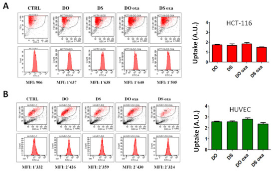 To evaluate liposome internalization, HCT-116 and HUVEC cells were incubated with empty and loaded fluorescent liposomes for 3 h and then analyzed by cytofluorimetry to measure the fluorescence of internalized liposomes (Figure 4). The mean fluorescence intensity after background subtraction and proper normalization (see Materials and Methods) were reported as arbitrary units (A.U.) (Figure 2). Indeed, the uptake levels of the four formulations (DO, DS, DO-oxa, DS-oxa) did not differ from each other, in both the cell lines (Figure 4).