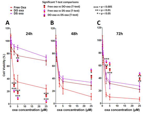 Inhibitory concentration (IC50) of free oxaliplatin and oxaliplatin-loaded liposomes. IC50 values were calculated by GraphPad Prism software through interpolation with curves of Figure 5. Statistical significance was calculated by the t-test; comparisons DO-oxa vs. DS-oxa, DO-oxa vs. Free Oxa, DS-oxa vs. free oxa were significant at 48 h and 72 h (p < 0.05).