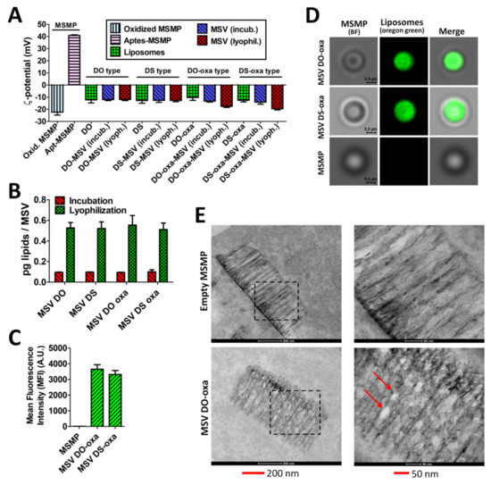 MSV assembly. (A) ζ-potential analysis of the empty MSMPs, selected liposomes and assembled MSVs; (B) amount of fluorescent liposomes loaded into the MSMP and measured by spectrofluorometer; (C) relative levels of mean fluorescence intensity (MFI) of liposomes loaded into the MSMP (i.e., MSV assembly) measured by cytofluorimetry (see also Figure S2); (D) qualitative analysis of MSV assembly by confocal microscopy; (E) TEM micrographs of the MSV. An empty MSMP and MSV DO-oxa are showed. Experiments were performed in three independent replicates. Error bars represent standard deviations. Statistical significance was calculated by one-way two-tailed t-test. Abbreviations: incub.—incubation; lyoph.—lyophilization; incub. and lyoph. refer to two methods for MSV assembly (see Materials and Methods section); A.U.—arbitrary units.