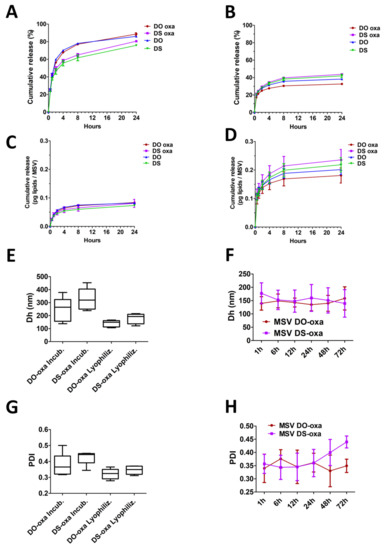 We then measured the size of the liposomes released after 1 h by DLS (Figure 7E,F). In both the applied loading methods, we registered an increase in the diameter of released liposomes, with higher values for those obtained by means of the incubation assembly protocol: in fact, MSV DO-oxa and MSV DS-oxa, assembled by incubation, after 1 h, released liposomes with a mean size of 245 ± 94 and 326 ± 85 nm, respectively, while their counterparts obtained by lyophilization, exhibited a mean size of 140 ± 25 and 177 ± 39 nm, respectively. All the released liposomes showed a relative dimensional homogeneity with a mean PDI below 0.45 (Figure 7G,H).