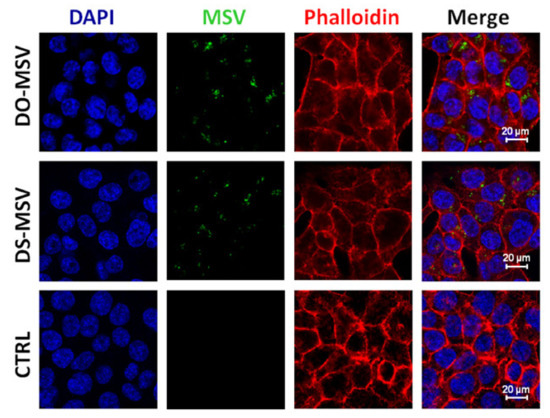 We treated HCT-116 with fluorescent MSV-DO-oxa and fluorescent MSV DS-oxa (assembled by lyophilization), and after 24 h, we measured the MSV fluorescence inside the cells by confocal microscopy (Figure 8). After 24 h of incubation, most of the fluorescent liposomes remained inside the MSV, as shown by release dynamics (Figure 7B). Thus, in this experiment we assigned the green fluorescent signal (Figure 8) to liposomes still inside the MSV and not to released liposomes. This analysis indicates that HCT-116 cells easily internalize the entire MSV particle (together with its liposomal payload), as shown in other cellular models (Figure 6E) [11,18].