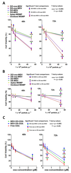 To measure the cytotoxicity of the MSVs and of the empty MSMPs, we evaluated the viability of cells treated with MSV DO-oxa, MSV DS-oxa, MSV DO, MSV DS and the empty MSMP (in both oxidized and APTES-modified form) (Figure 9A,B). In HCT-116 cells, the cytotoxicity of the empty MSMPs, MSV DO and MSV DS was already evident (66% ± 4% to 71% ± 4% cell viability) at 48 h, with the highest tested concentration (50 × 104 particles/µL medium), whereas, as expected, MSV DO-oxa and MSV DS-oxa caused a significantly higher reduction (38% ± 3% to 40% ± 2% cell viability) (Figure 9A). After 72 h, the cytotoxic effect of MSV DO-oxa and MSV DS-oxa was even higher, with a significant difference between MSV DO-oxa (22 ± 2% cell viability) and MSV DS-oxa (33 ± 2% cell viability) at a concentration of 50 × 104 particles/µL medium (Figure 9A).