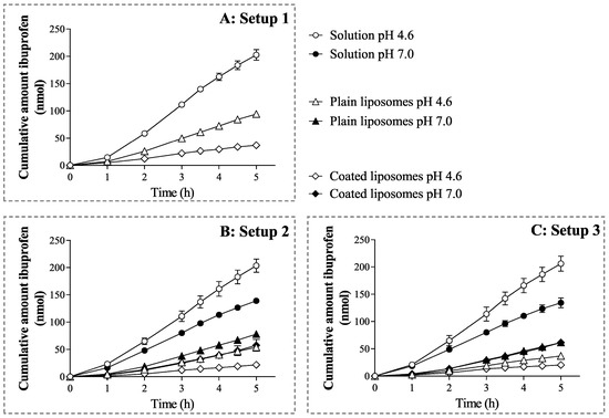 3.3. Dependence of Ibuprofen Permeability on the Formulation Type, Experimental Setup, and pH