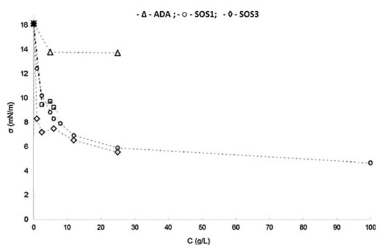 Reduction in interfacial tension between water and rosemary essential oil with the addition of ADA (-Δ-), SOS1 (-o-), and SOS3 (-◊-) (adapted with permission from [34]).