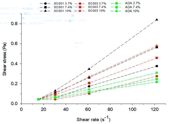Shear stress vs. shear rate plots for starch grades of sodium octenyl succinate starches (SOS: high viscosity, SOS1 and low viscosity, SOS3) and acetylate di-starch adipate (ADA).