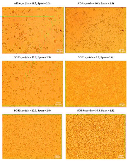 In Figure 4, images of the six feed emulsions of the three starch grades stabilized with PSC (emulsions ADA0_100, SOS10_100, SOS30_100), or with PLM/PSC (ADA80_20, SOS180_20, SOS380_20) are shown together with corresponding median droplet diameter and distribution span values. Comparing the two chemically different starches, it appears that SOS provided more uniform PSC emulsions (lower span) and smaller d50 than ADA. However, these differences were diminished when the combination of PLM/PSC was used for encapsulation. PLM/PSC emulsions had slightly smaller d50 (9.9–10.8 μm compared to 11.5–12.3 μm) and lower span (1.6–1.8 compared with 1.9–2.3), indicating more uniform size distribution and emulsion stability.