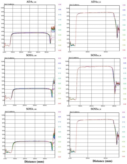 Back scattering (Y-axis, %) vs. distance (X-axis, mm) profiles of feed emulsions of the three starch grades: ADA, SOS1, and SOS3 stabilized with polysaccharides only (ADA0_100, SOS10_100, SOS30_100), or polymer/polysaccharides 80/20 (ADA80_20, SOS180_20, SOS380_20). (Different color curves correspond to different measurements taken at increasing 5 min time steps).