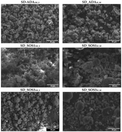 In Figure 6, SEM images of spray-dried powders of the three starch types prepared from emulsions stabilized with PSC only (SD-ADA0_100, SD-SOS10_100, SD-SOS30_100) or PLM/PSC (SD-ADA80_20, SD-SOS180_20, SD-SOS380_20) are shown. They consist of mixtures of single particles and particle agglomerates. Powders prepared with PSC contain a large number of shriveled particles and agglomerates, which is reflected on the higher shape index values between 1.96 and 2.17 compared with 1.64 to 1.81 for the PLM/PSC (Table 3). In particular, the presence of polymers in the encapsulating wall (products SD-ADA80_20, SD-SOS180_20, SD-SOS380_20) resulted in the smoothing of particle surfaces by eliminating the cavities seen in the PCS products.